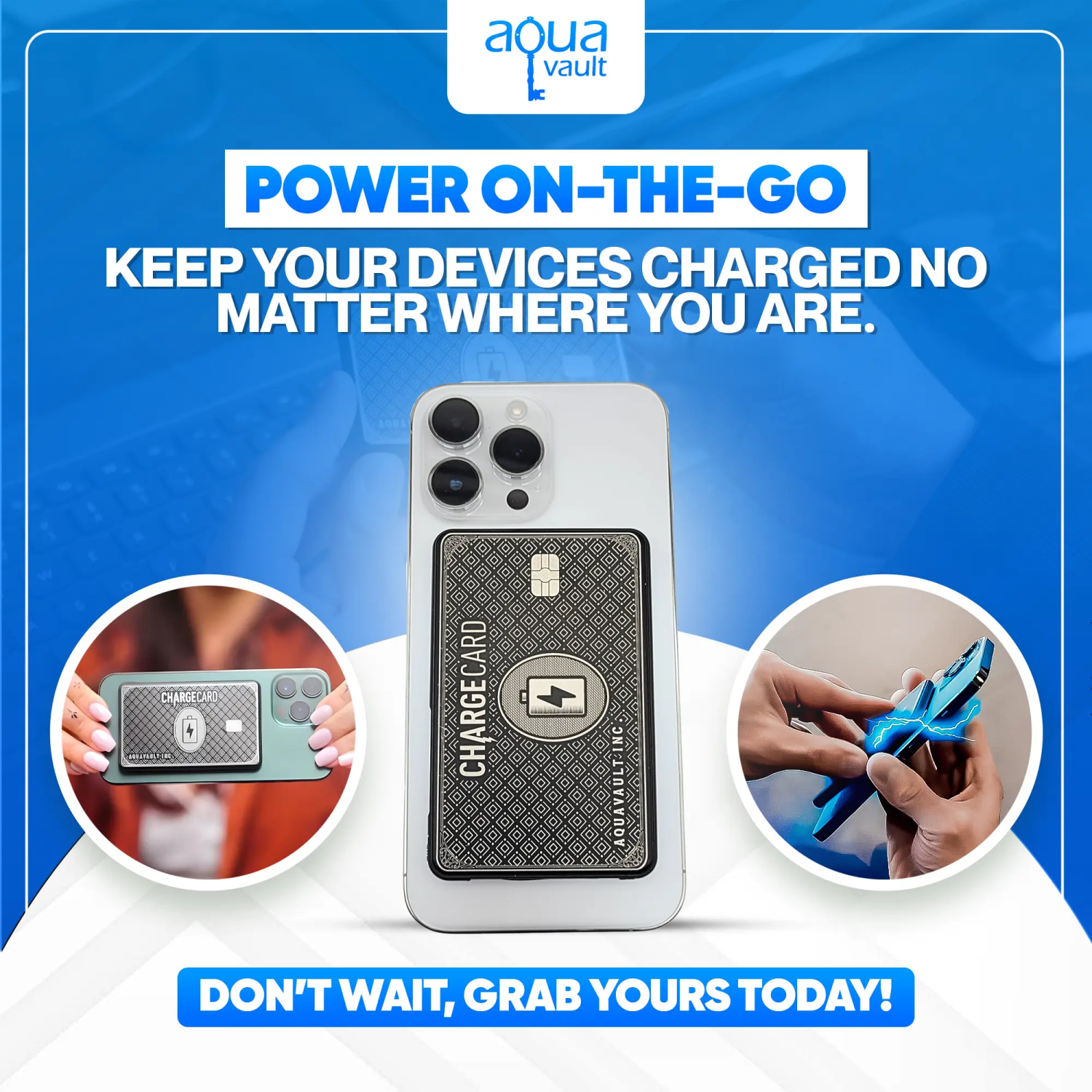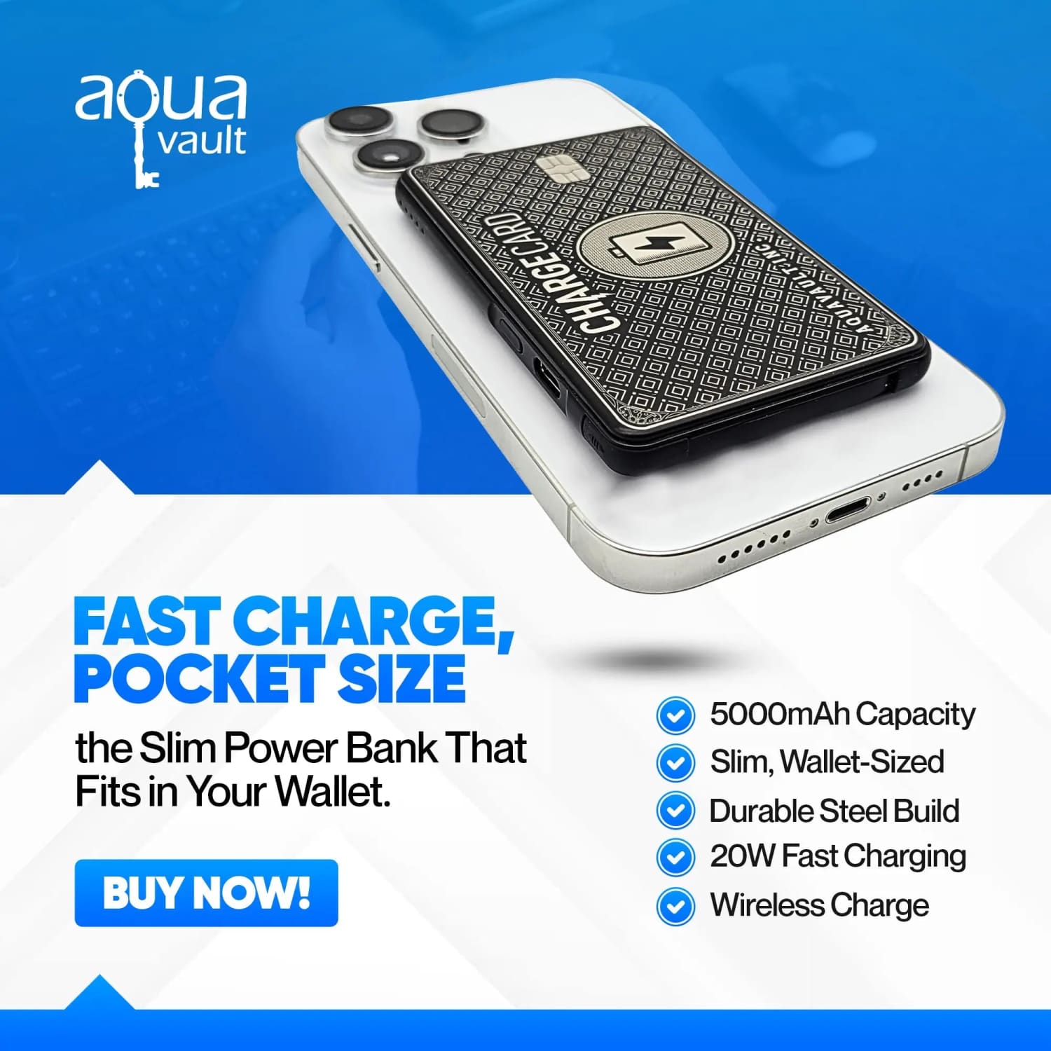 Whether you’re exploring a new city, crushing it at a trade show, or just navigating a busy day, the AquaVault Wireless ChargeCard keeps you connected without weighing you down. Order now and experience the freedom of power in your pocket!