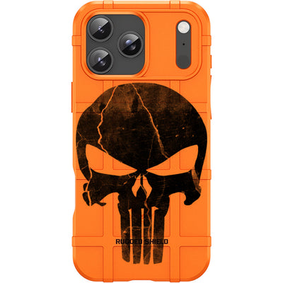 Orange Rugged Shield TPU Case with MagSafe Ring - Cracked Punisher Skull Design for iPhone 17 Pro & 17 Pro Max phone models